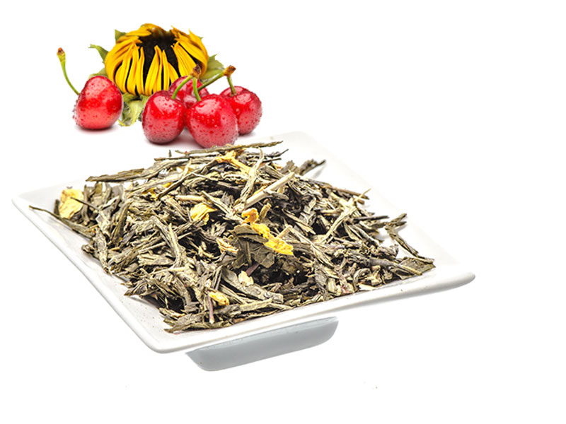 Green flavored tea, cherry flakes, sunflower blossoms. Package: 100g.